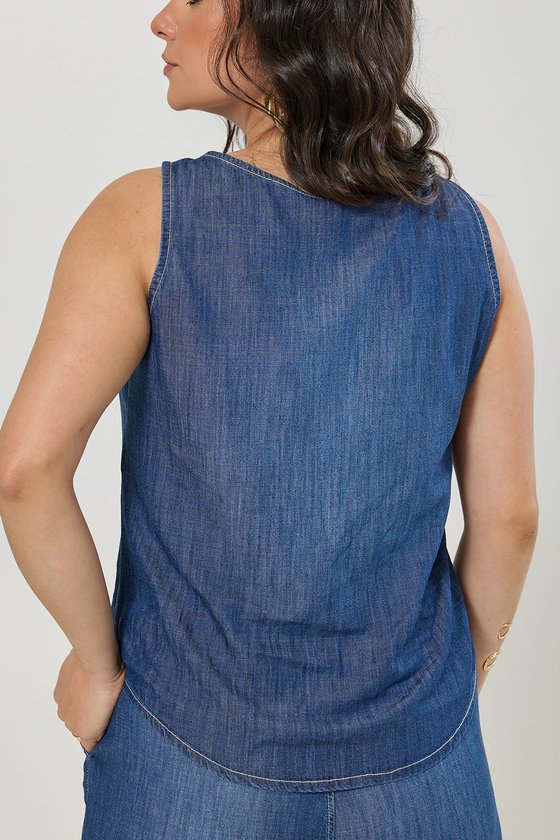 A blusa regata jeans é uma peça versátil e atemporal, ideal para compor produções leves e modernas em qualquer estação. Produzida em jeans de toque suave e fluido, com composição de algodão e viscose, garante conforto, respirabilidade e um caimento natural que valoriza a silhueta com elegância. O modelo apresenta decote redondo clássico e cavas bem estruturadas, proporcionando praticidade e frescor nos dias mais quentes. Seu design minimalista e clean torna a peça perfeita tanto para looks casuais, combinada com shorts ou saias, quanto para produções mais sofisticadas, em sobreposição com camisas e acessórios marcantes.