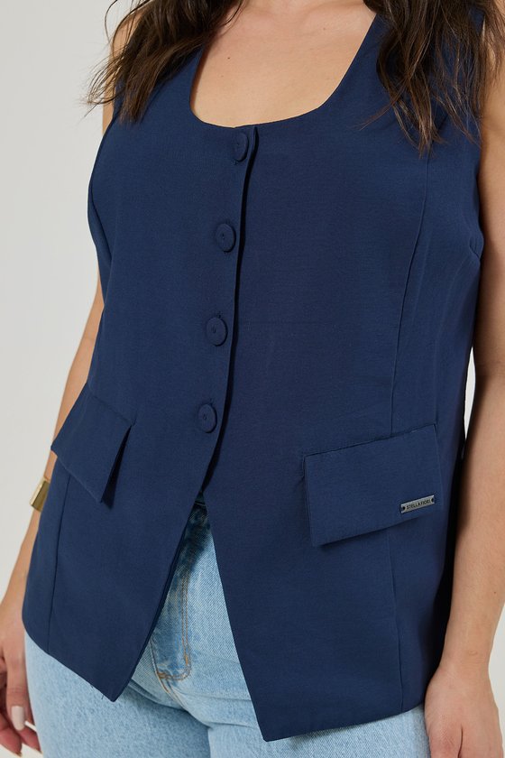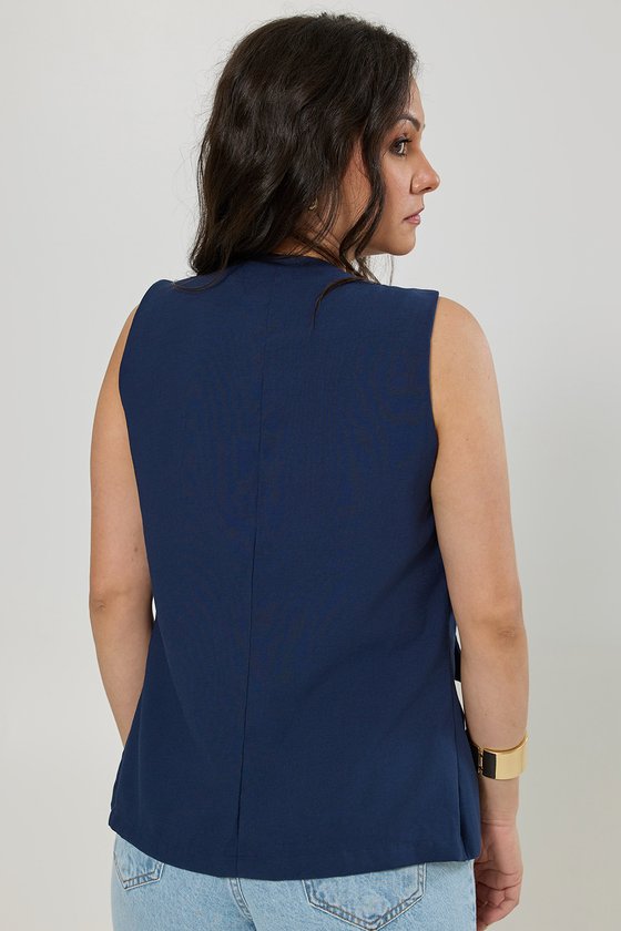 Colete Alongado de Alfaiataria combina elegância e versatilidade em uma peça atemporal, destaca-se também por sua modelagem. Confeccionado em tecido de alta qualidade, com composição de viscose e poliéster, oferece toque macio, caimento fluido e estrutura levemente encorpada, proporcionando conforto e sofisticação ao vestir. Seu design conta com decote em U. O fechamento frontal com botões encapados no mesmo tecido, que garantem um acabamento uniforme e refinado. Os bolsos funcionais com lapela adicionam praticidade sem abrir mão do estilo, enquanto a modelagem alongada valoriza a silhueta e confere um visual moderno e alongado. Na cor azul-marinho, a peça transita facilmente entre produções formais e casuais, podendo ser usada sozinha ou sobreposta a blusas para compor looks elegantes e atuais.