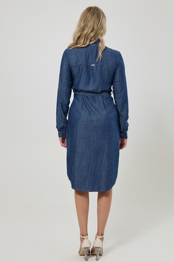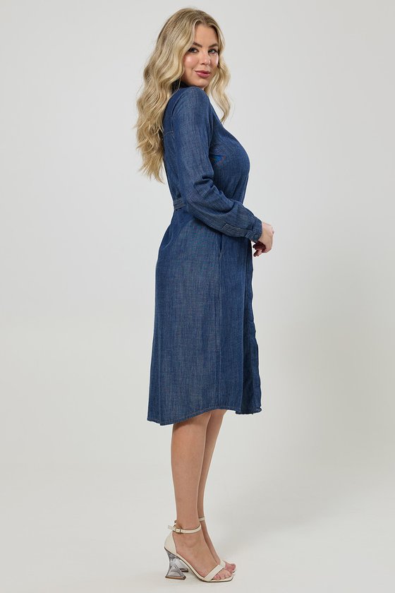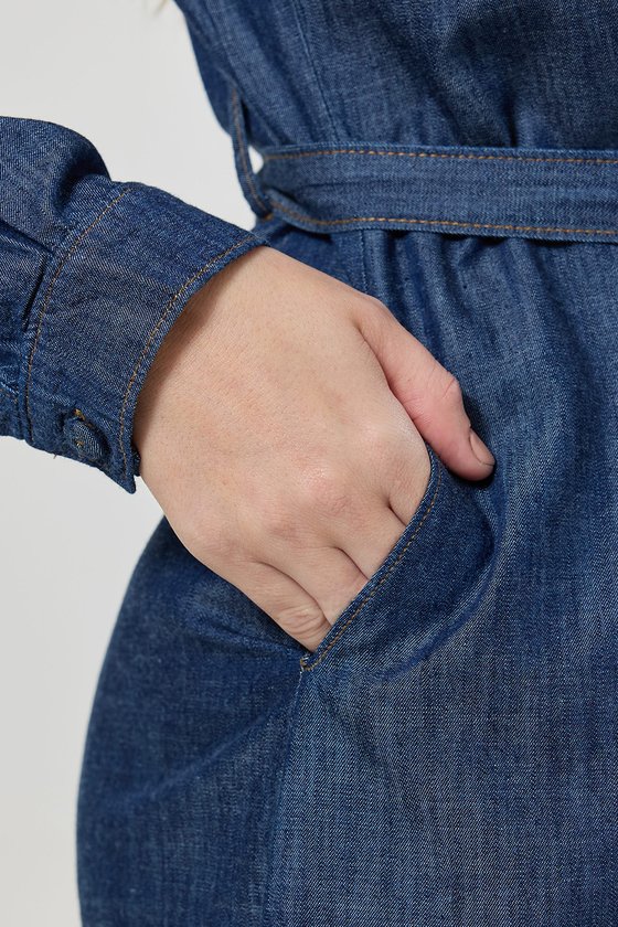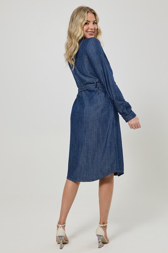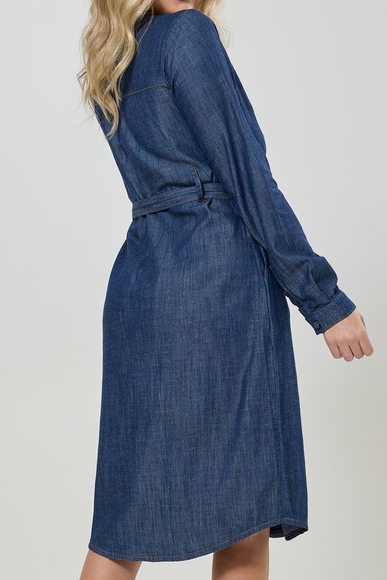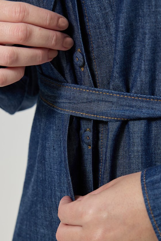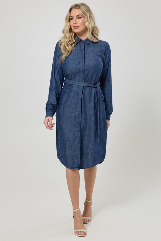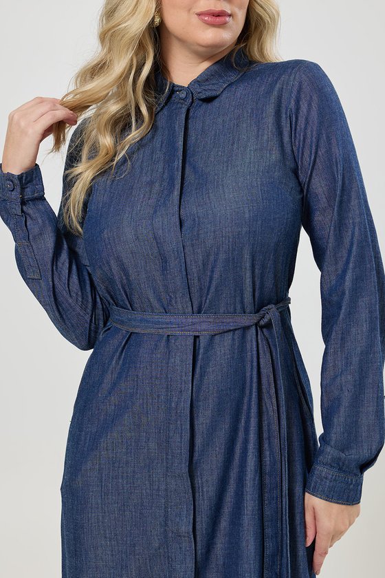 Vestido Chemise Jeans Midi Manga Longa – Alanna confeccionado em jeans de viscose com algodão, oferece um toque macio, frescor e um caimento fluido que valoriza o corpo com conforto. O modelo tem fechamento por botões com peitilho duplo, deixando os botões escondidos, que deixa o visual mais elegante, além de passantes para o cinto que ajudam a marcar a cintura e dar mais shape à silhueta. As mangas longas trazem um toque clássico, enquanto o comprimento midi garante versatilidade.O tecido leve e a modelagem soltinha fazem dele uma ótima escolha para quem gosta de unir conforto e estilo em uma única peça.