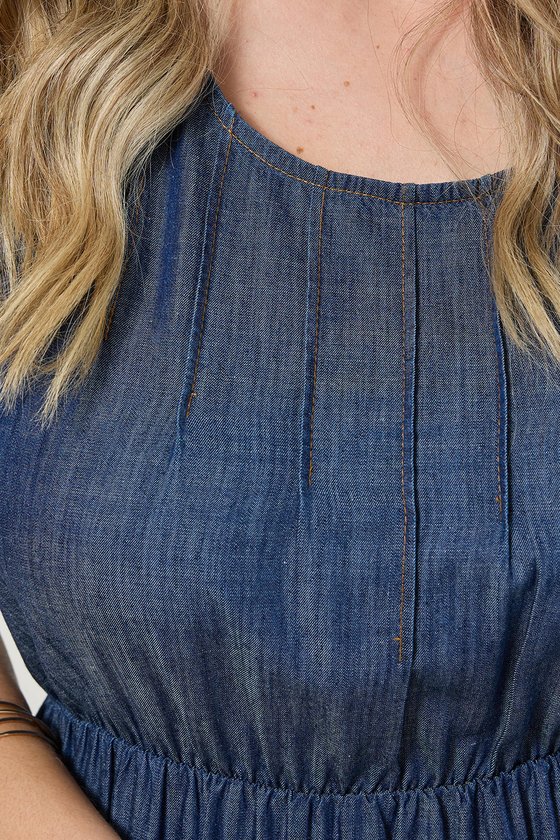 O modelo apresenta decote redondo e manga curta, equilibrando feminilidade e conforto. O destaque está no busto com delicado detalhe de nervuras, que adiciona textura e elegância à parte superior da peça.
